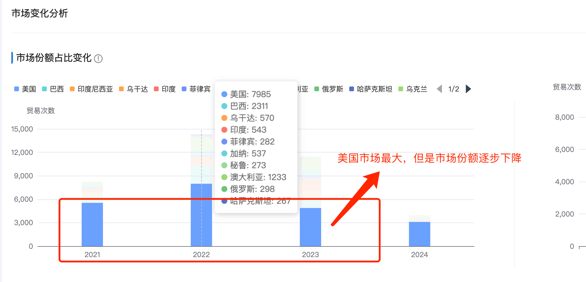 1. 九州ku游官网商情洞察市场分析新增「市场占比变化分析」:分析每年的头部市场的占比排名和变化,哪些市场持续排名在头部,哪些市场排名逐渐下滑甚至消失在top之外的。